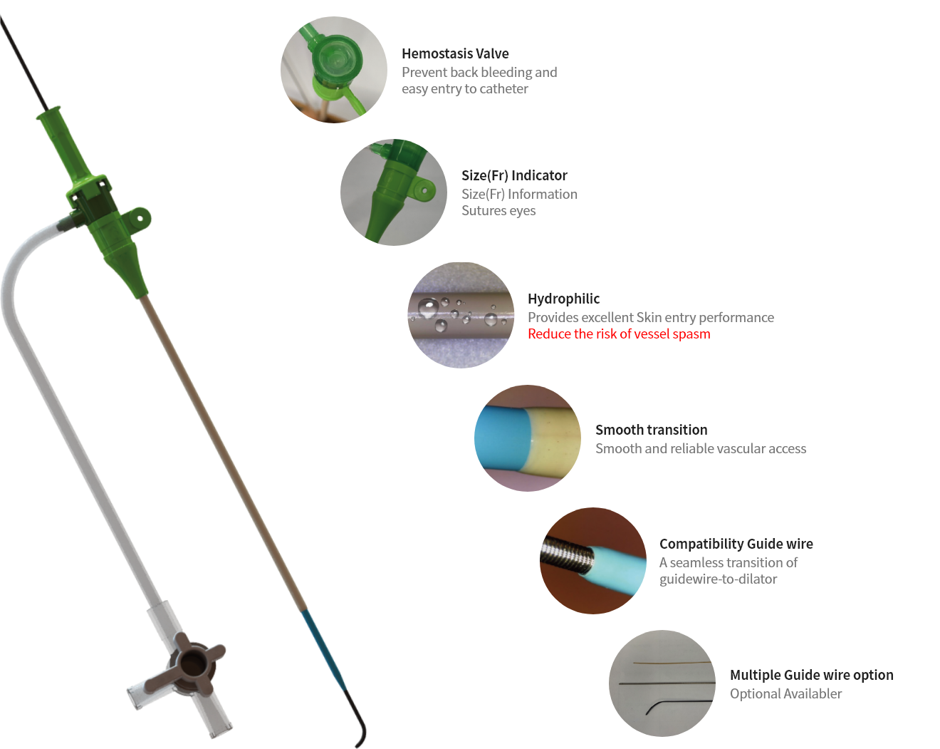 – Excellent blood vessel entry performance with low sheath and dilator gap – Application of hydrophilic coating to improve entry performance – Various accessory for user convenience