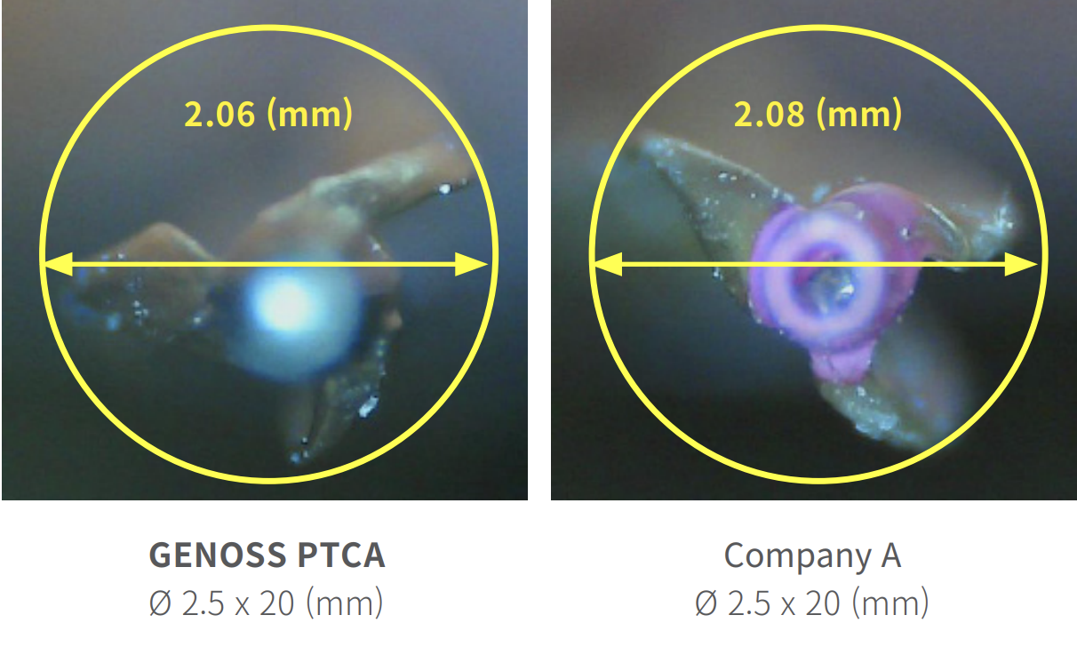 The GENOSS PTCA Balloon Catheter has a thin diameter feature, and advanced balloon folding technology shows excellent performance.